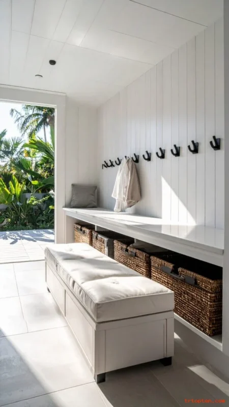 Pick a bench cushion made from outdoor fabric for quick drying and easy cleaning.Place a lidded hamper near the bench for wet suits and towels. This setup keeps the main room tidy even on busy days.