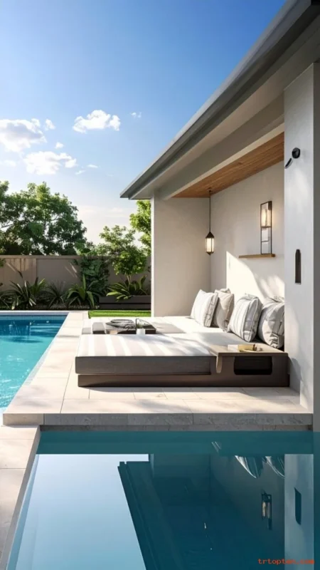 Create a daybed nook for relaxing and drying off in comfort. Use built-in sides or a low platform so it feels tidy and intentional.Pick performance fabric for pillows and covers to resist moisture and fading.