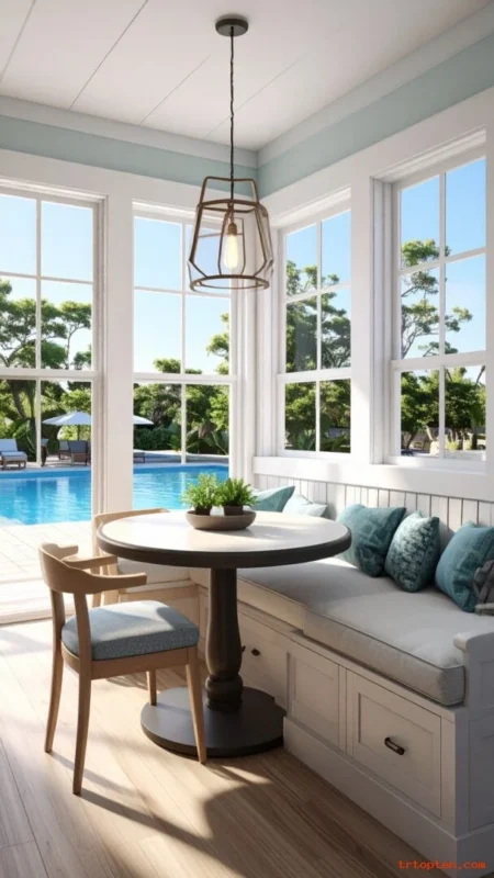 A banquette saves space and seats more people than separate chairs. It creates a cozy corner for meals, games, and late-night snacks.Use storage under the seat for towels, pool toys, or board games.