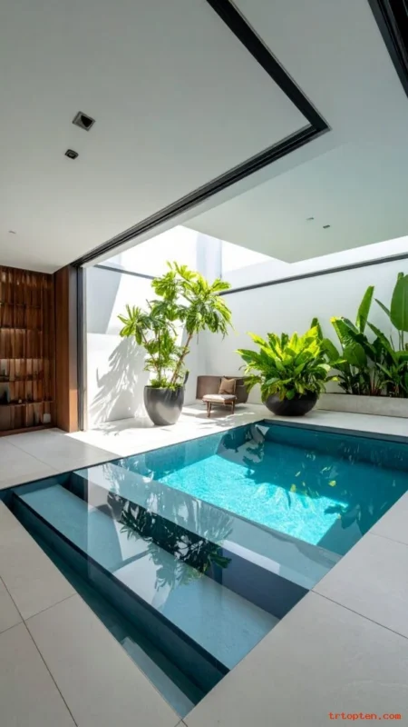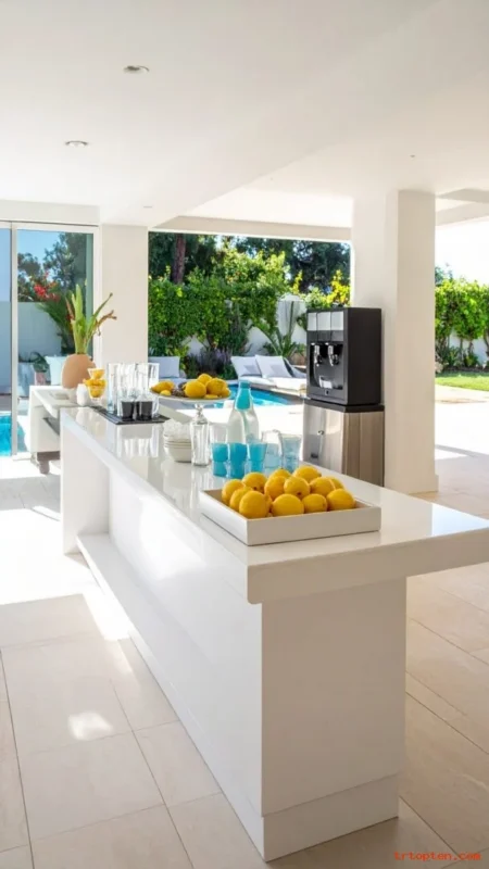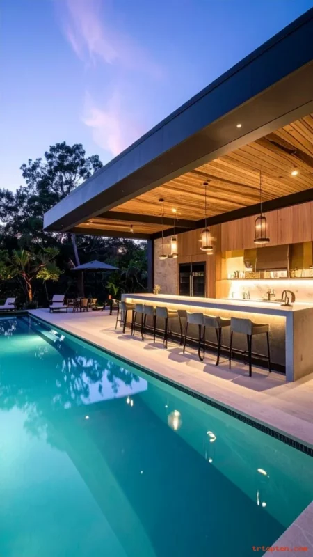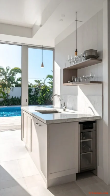 Add a compact wet bar so snacks and cold drinks stay close to the pool. Install a mini fridge and a small sink for quick rinsing and easy hosting.Use quartz or sealed stone for the countertop so it resists water marks.