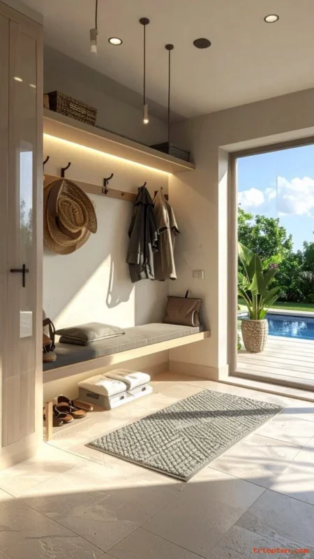 A drop zone near the door stops mess before it spreads. Add a durable mat, wall hooks, and a small bench right by the entry.Use a narrow shelf for keys, sunscreen, and goggles.