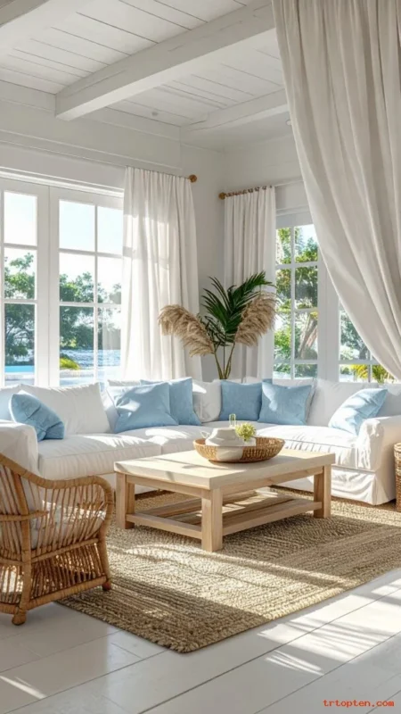 Place side tables near each seat so guests can set down drinks and sunscreen.Hang soft linen curtains and use warm wood accents for a beachy finish. Keep decor minimal so the room feels open and calm.