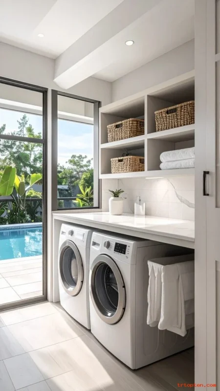 Use labeled baskets so guests know where clean items go.Install a folding counter if you have the space. This station saves time and keeps the pool house ready for the next day.