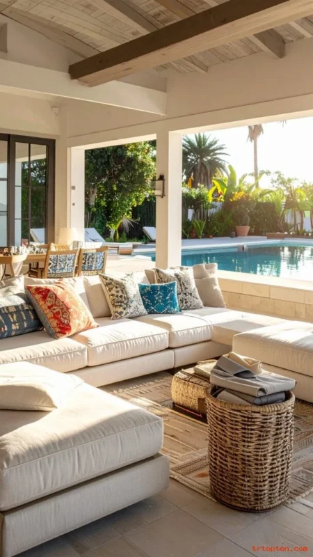 Choose slipcovered sofas and woven chairs to create a relaxed hangout zone. Use light colors and airy fabrics so the space feels cool after a swim.Add a chunky jute rug and a simple coffee table that can handle wet feet.