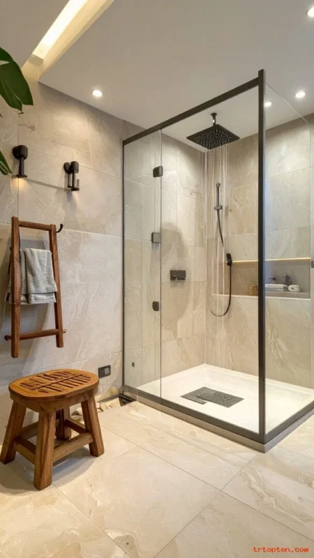 Place a teak stool and hooks for towels so the space feels like a spa.Use a glass door to keep the room bright while controlling moisture. Add a quiet exhaust fan to keep the air fresh.