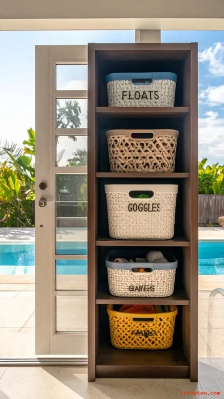 Pool toys can take over fast, so give them a home. Use a tall cabinet or built-in closet near the door.Add bins inside to separate floats, goggles, and games.