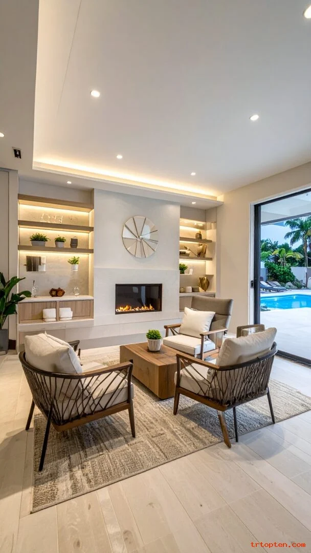 Keep the fixture easy to wipe since pool spaces gather moisture and dust.Add dimmer controls for flexible mood lighting. This detail makes the pool house feel more like a true living space.