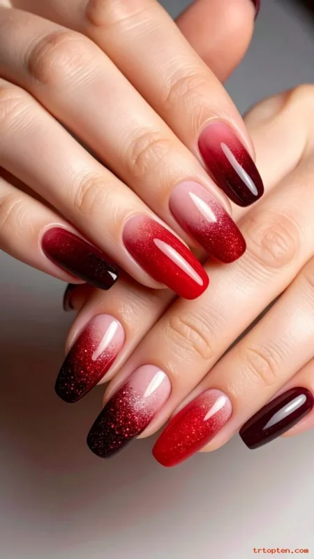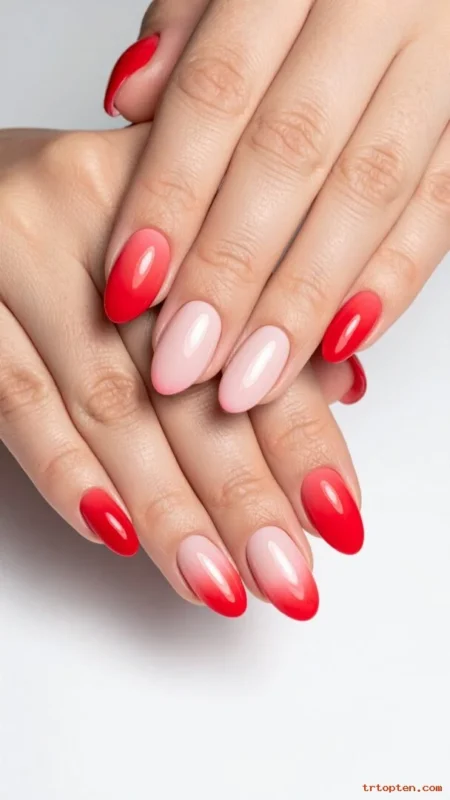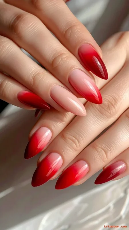 Red ombré creates a soft blend that looks smooth and trendy. It can fade from nude to red or from pink to red.