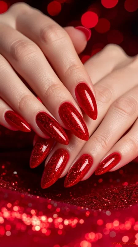 Use a fine red glitter so the surface looks smooth. Add two coats of top coat for a glassy finish.