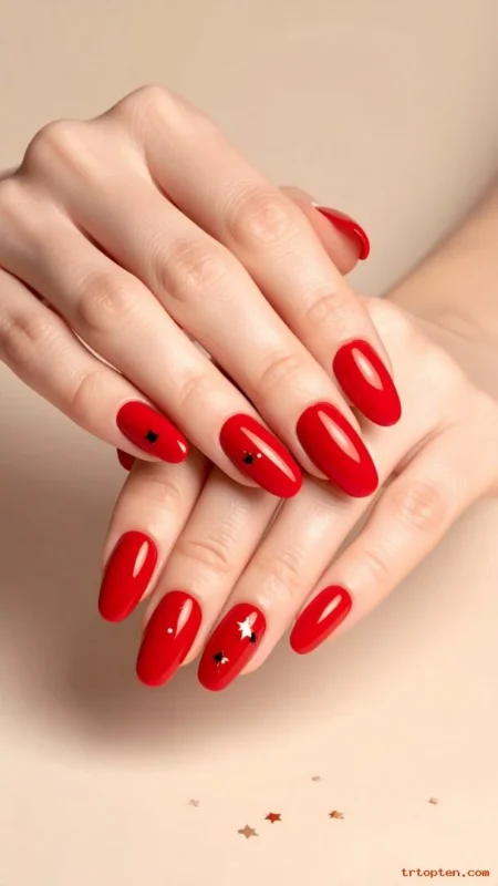 Add small gold or white star decals on one or two nails. Keep the rest solid red to maintain balance.