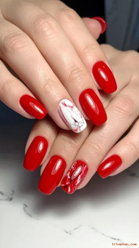 Red marble nails look artistic and bold. The pattern adds depth without needing extra colors.