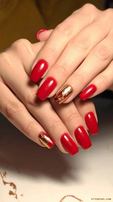 Place small foil pieces near the cuticle or scatter them lightly across two nails. Keep the rest of the nails solid red for balance.