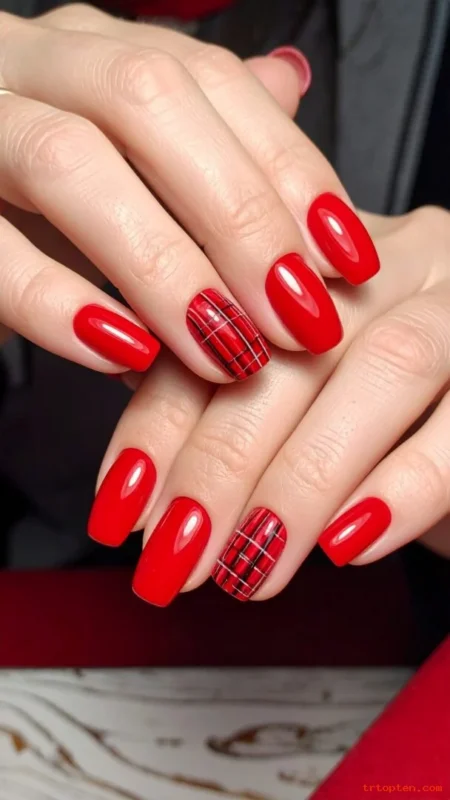 Use a red base and add thin lines in black and white to form plaid. Keep one or two nails plaid and leave the rest solid red.