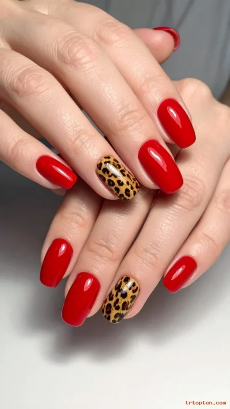 Paint most nails solid red and add leopard spots on one or two nails using tan and black. Keep the spots small and spaced for clarity.