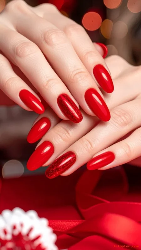 Paint four nails in a solid red and use red glitter on the ring finger. Use a smooth top coat so the glitter feels flat and shiny.