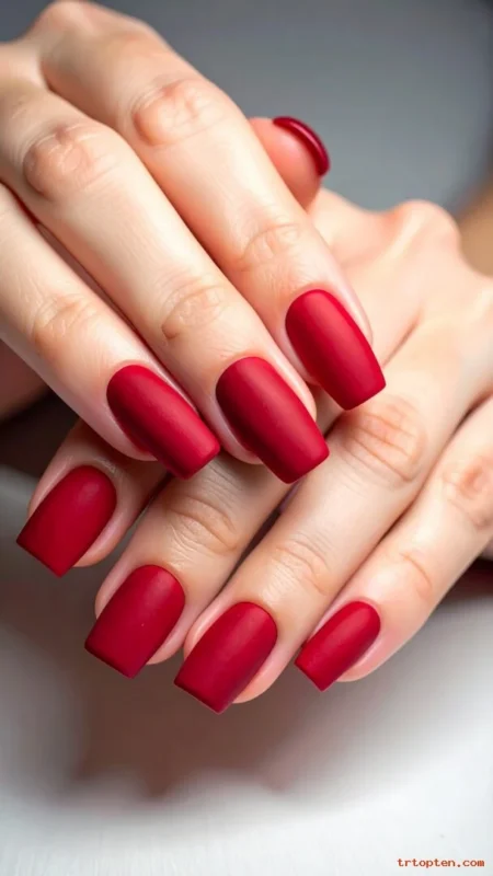 Matte red feels soft and stylish, like velvet fabric. It makes even a simple manicure look special.
