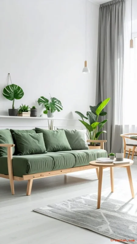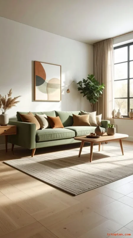 Choose a sage green sofa with clean lines so it feels modern and easy to style. Let the sofa anchor the room and keep walls neutral.