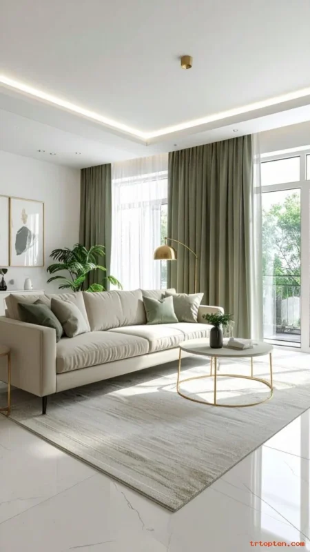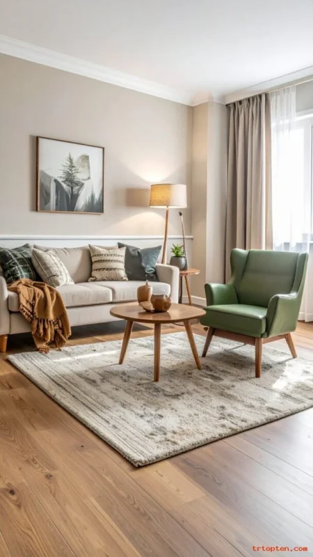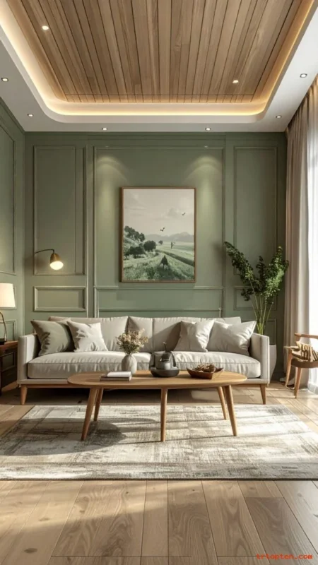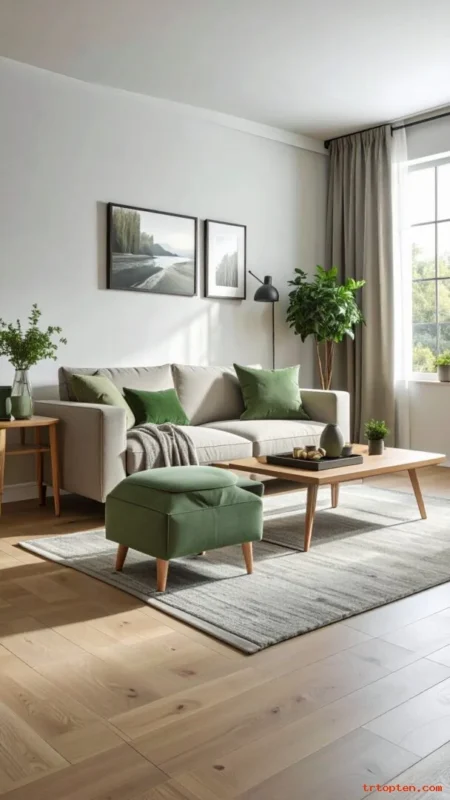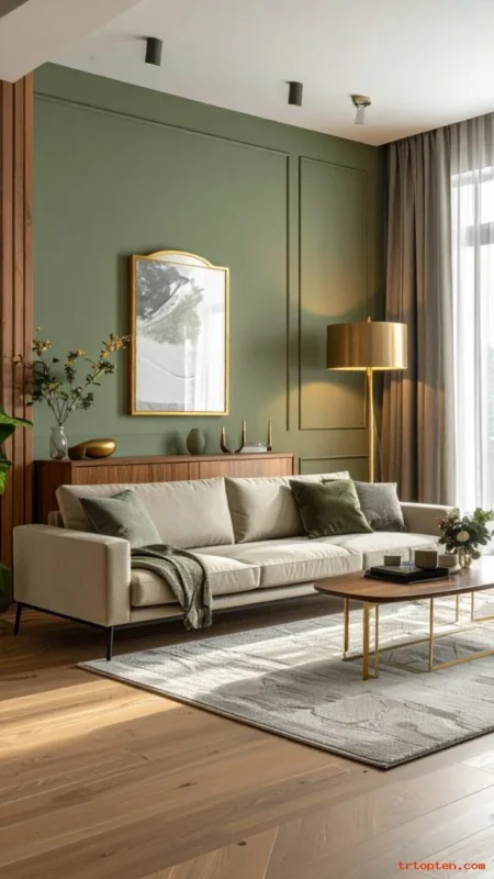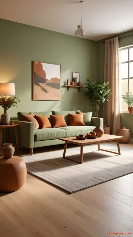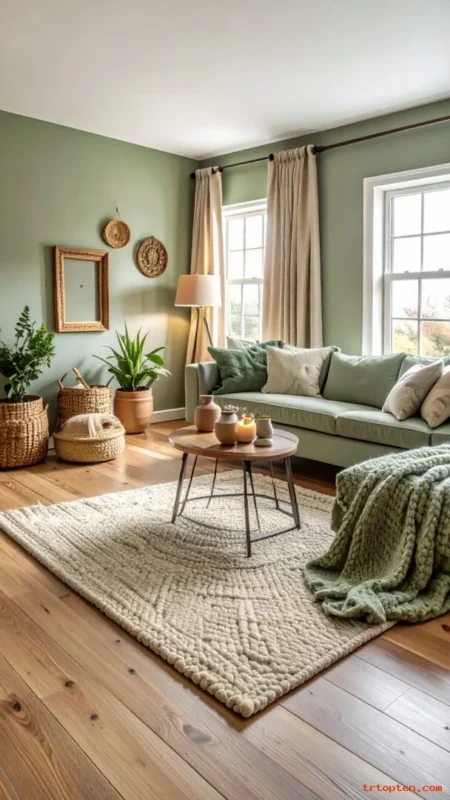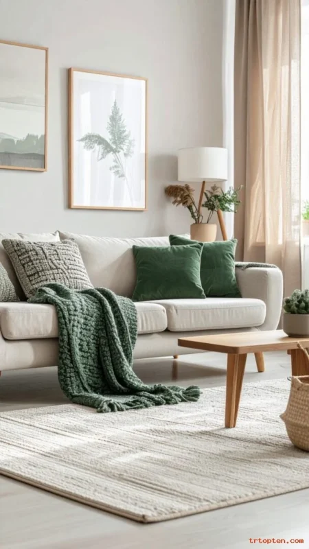Build a soft palette with sage green, cream, and beige. This mix feels relaxed and works in many home styles.