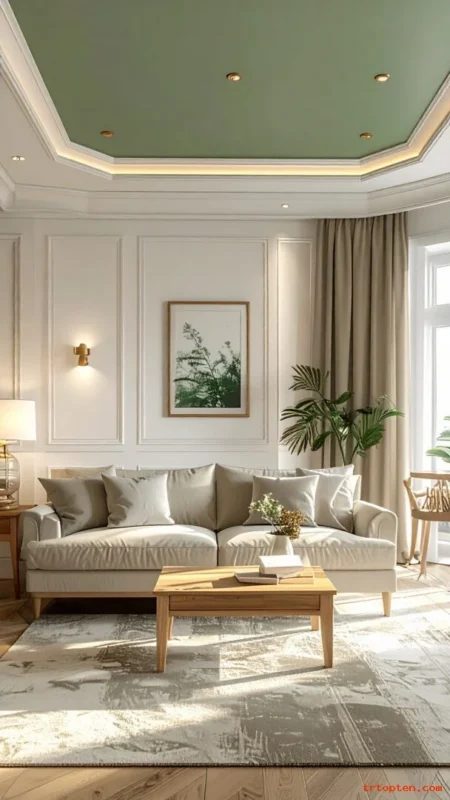 Use white crown molding to frame the ceiling color. Add warm lighting so the ceiling looks soft, not dark.