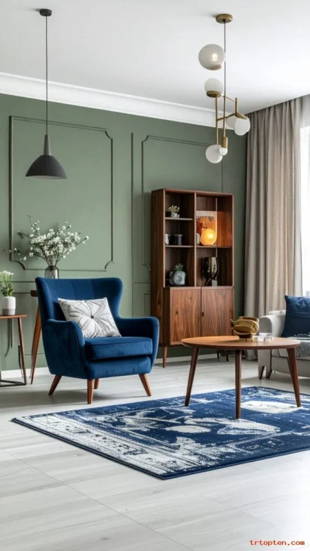 Use sage green in one clean feature, like a wall or a sofa, and keep everything else simple. This style looks calm and organized.