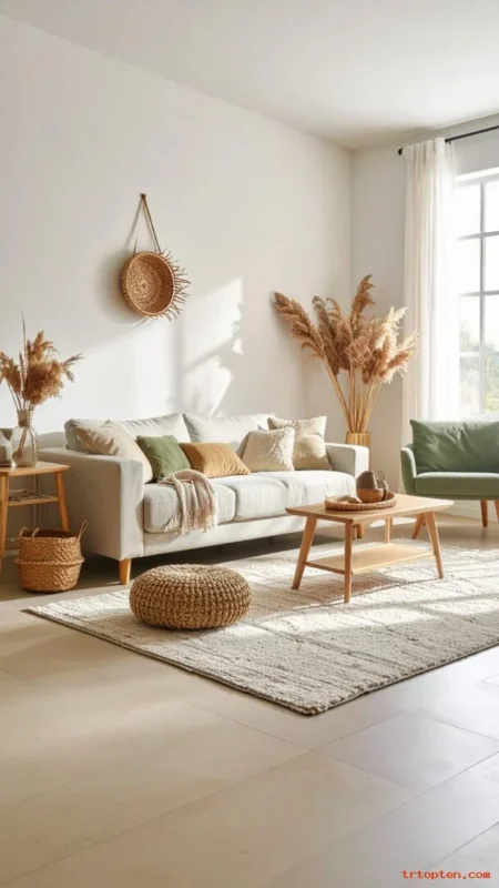 This makes the room feel light and clean. Use pale wood furniture and simple shapes. Add a few plants and keep decor minimal.