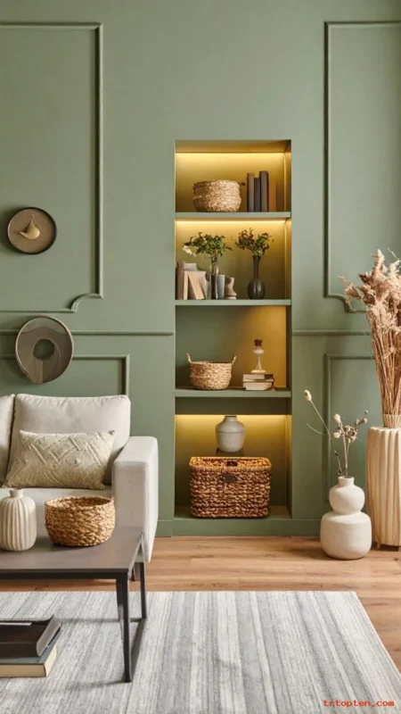 Paint built-in shelves sage green to create a strong focal point. The color helps books and decor pop without looking loud.