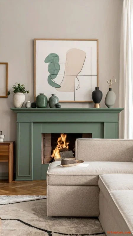Paint a fireplace surround sage green to create a strong centerpiece. This works in both modern and traditional rooms.