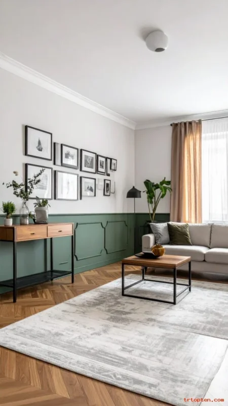 Add vertical or square wall panels and paint them sage green. The panel lines create texture and make the wall look custom.