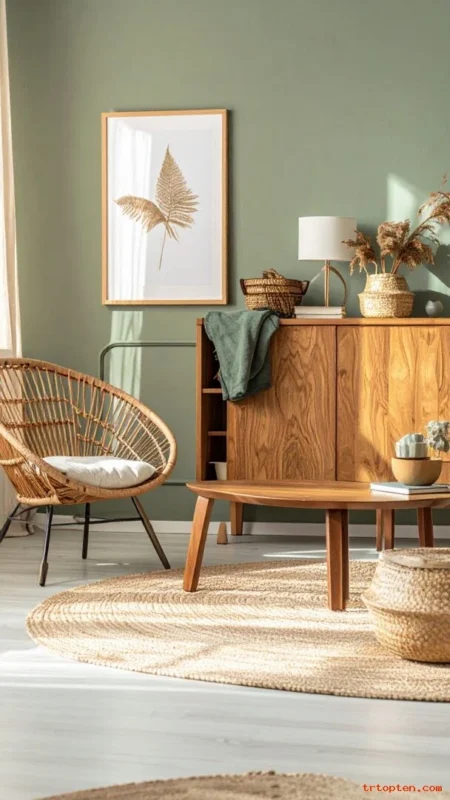 Use sage green on walls or textiles and add natural wood furniture for a cozy tone. Wood warms the green and makes the room feel grounded.