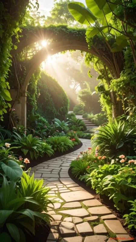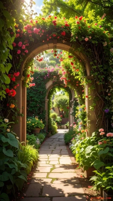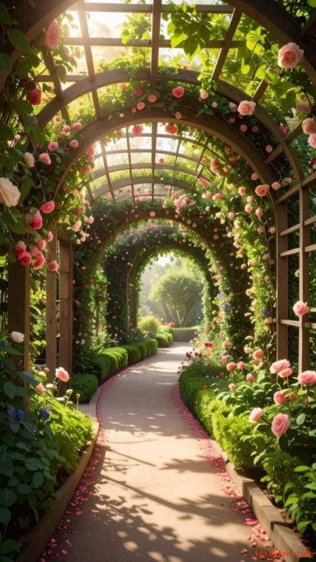 A tunnel makes your path feel secret and exciting. Trellises on both sides create a living corridor. Flowers above you make it feel magical.