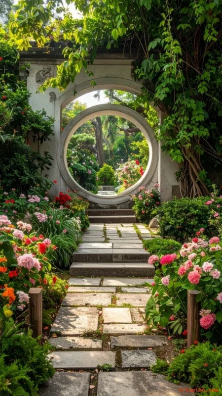 A moon gate creates a dramatic entrance. The circular shape feels timeless and elegant. It turns a simple fence line into a feature.