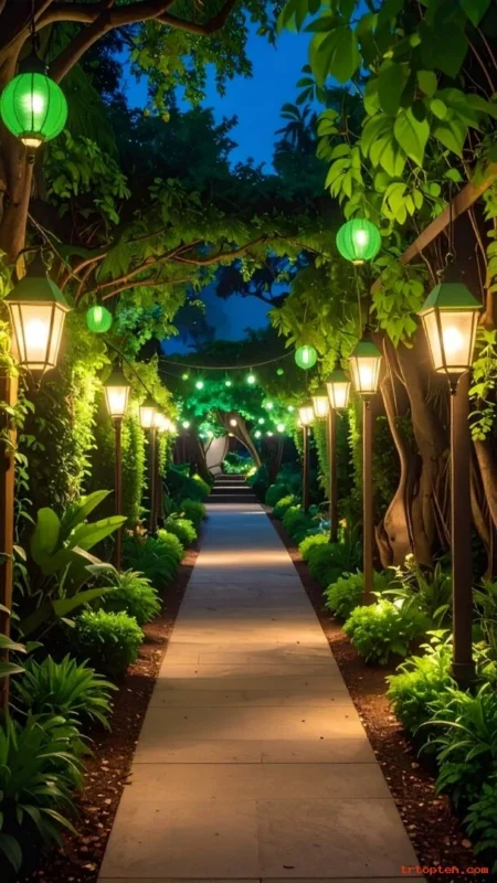 Soft lighting turns any garden into a secret retreat after sunset. Lanterns guide the path and add warmth. You can use solar stakes or candle lanterns.