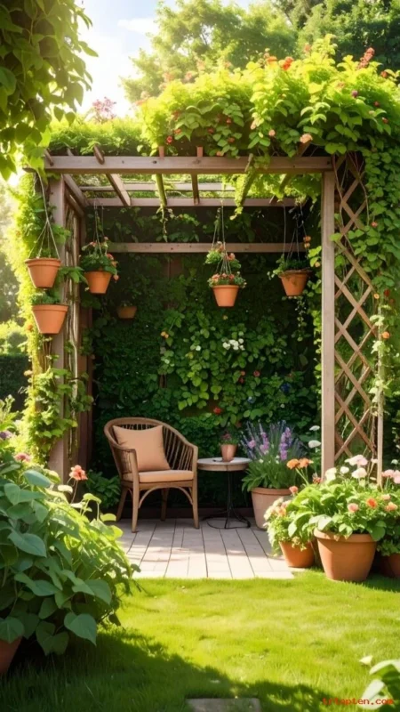 A tall trellis can act like a garden wall. It blocks views and creates a separate “room” outdoors. You can cover it with vines or hang pots for texture.