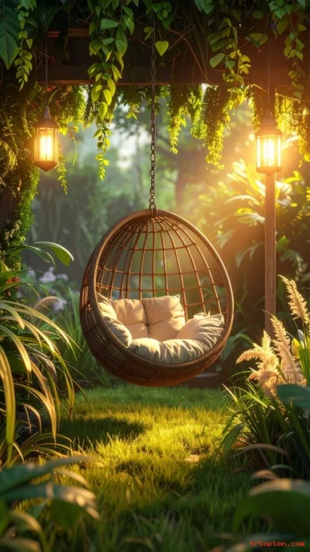A hanging chair creates a private lounging spot. It feels like a nest inside your garden. It also uses vertical space well.