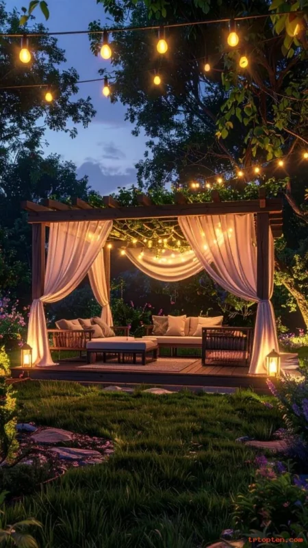 Warm white lights work best for a soft mood. Solar path lights, hanging lanterns, and string lights are easy options. Use several small lights instead of one harsh spotlight.