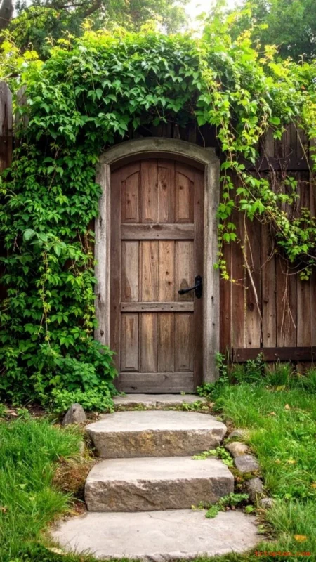 An old door on a fence feels like a hidden entrance. It adds story and charm without needing a full rebuild. The door can be real or decorative.