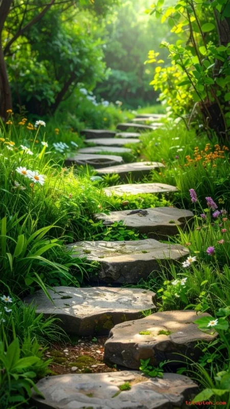 Use thyme, moss, or creeping phlox around stones. Let the plants fill gaps so the path looks woven into the landscape. This creates a lush “fairy garden” effect.