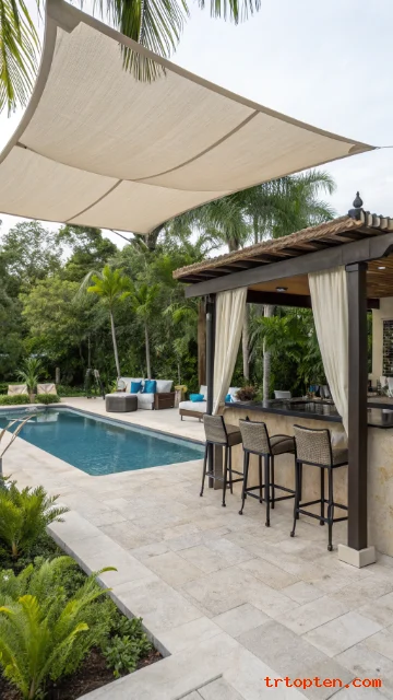 A shade sail over a pool cabana creates extra comfort and style. It can extend shade beyond the cabana roof and cover the pool edge.