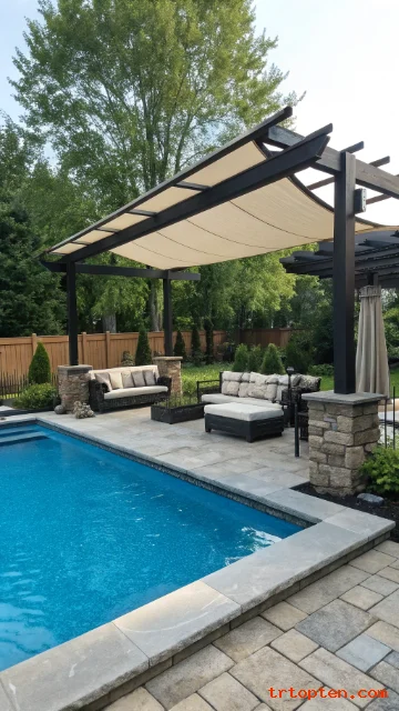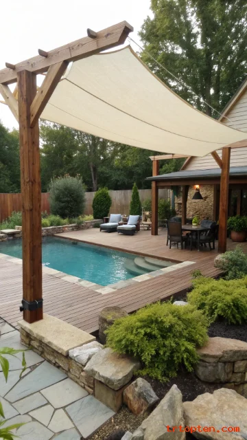 A pergola and shade sail combo gives the pool area structure and flexible shade. The pergola adds a frame, and the sail adds soft fabric coverage.