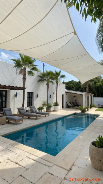 A white shade sail gives the pool area a fresh and bright look. It reflects light and keeps the space feeling open.