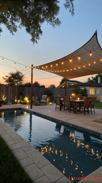 You can run outdoor-rated string lights along nearby posts or under the sail edges. Keep the lights clear of pool water and use safe exterior fixtures.