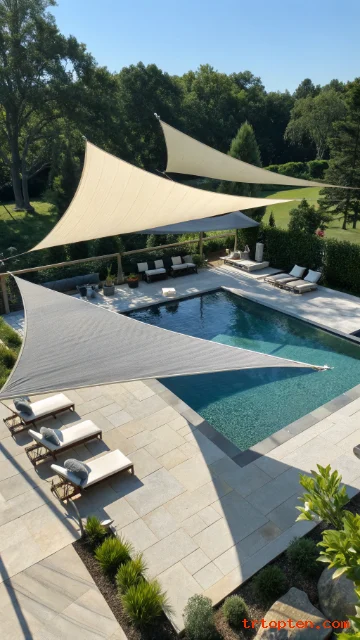 Layered triangle sails create a stylish look above a pool. The overlapping shapes give the space depth and make the design feel more custom.
