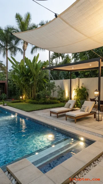 This idea helps people enter and exit the pool without stepping into intense sun. It also creates a pleasant spot for sitting in shallow water.