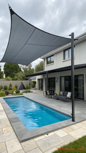 This idea suits contemporary homes with black window frames, metal fencing, or gray stone. The sail can make the whole pool area look sharper and more intentional.