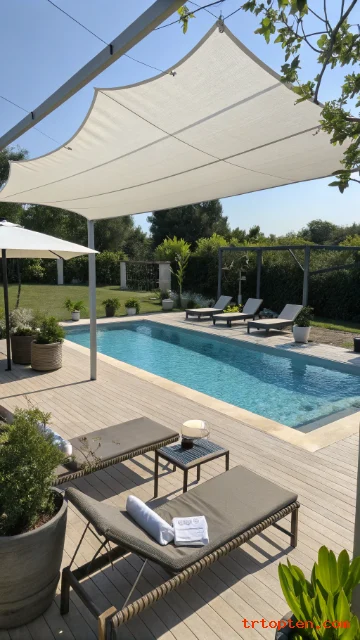 Place the sail high enough so the space still feels open. Use waterproof lounge chairs and small side tables for a complete poolside setup.