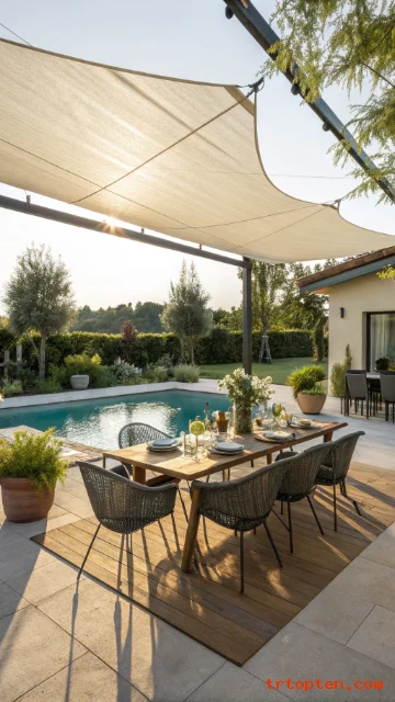 Match the sail color with cushions, tableware, or patio furniture. This small detail makes the poolside dining area feel planned and polished.