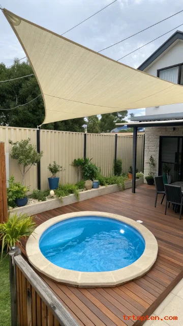 Use timber slat screens, metal panels, or tall hedges around the deck. Keep the sail color simple so the space does not feel closed in.