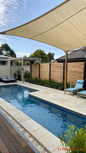 A shade sail can work with privacy screens to create a more comfortable pool zone. The sail blocks sun from above, and the screens block side views.
