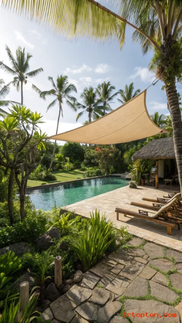 A shade sail can fit beautifully into a tropical backyard. It gives sun protection while letting palms and plants remain the main visual feature.