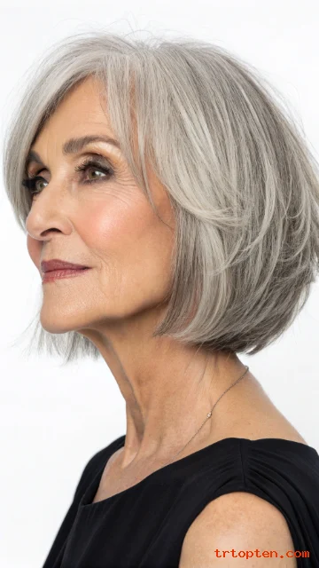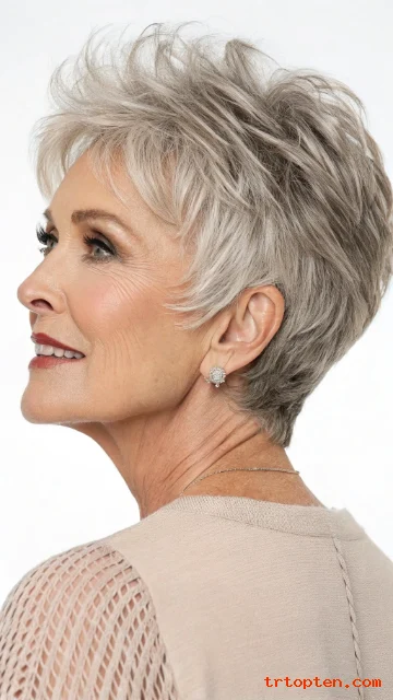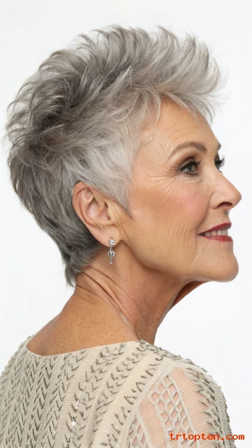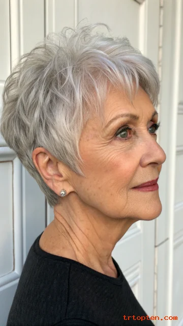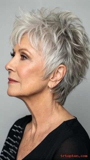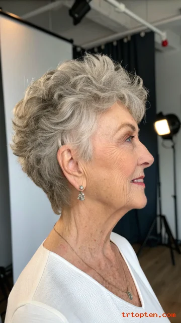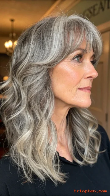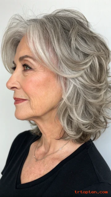 This style adds dimension, especially when hair is mostly gray or white. The texture also makes styling forgiving.